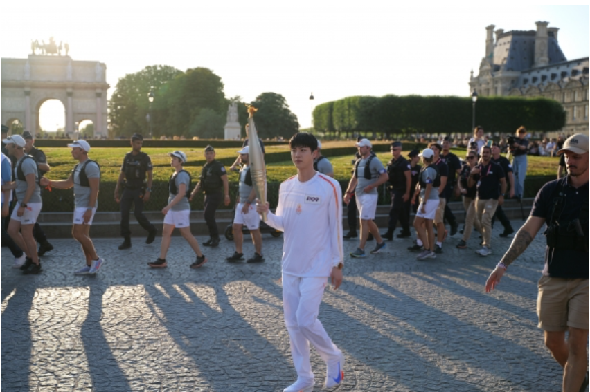파리 중심의 루브르박물관 앞은 진을 보기 위해 모인 팬들로 붐볐습니다. 오후 8시 20분 성화 봉송이 시작되기 수 시간 전부터 '어서와 진', '달려라 석진' 등의 한글 손팻말이나 태극기를 든 팬들이 눈에 띄었습니다. 루브르박물관 앞에서 약 200m를 성화 봉송한 진은 "오늘 성화 봉송에 참여할 수 있게 돼 너무 영광스럽다"며 "아미와 팬들께 감사하다"고 말했습니다.